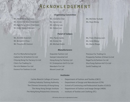 This year, the judging panel was comprised of the Consul-General of the Consulate General of Finland in the HKSAR and Macau, Ms. Annikki Arponen; Trade Commissioner of Italian Trade Commission in the HKSAR, Mrs. Paola Guida; Global Trend and Design Manager of Kopenhagen Fur, Mr. Michael Holm, Managing Director of Cyril Murkin (HK) Ltd., Mr. Timothy W. Everest, Deputy Executive Director of Hong Kong Trade Development Council, Mr. Benjamin Chau, socialites Ms. Marie Zhuge, Ms. Irene Wang, Ms. Flora Cheong-Leen and fashion designer Mr. Dorian Ho.