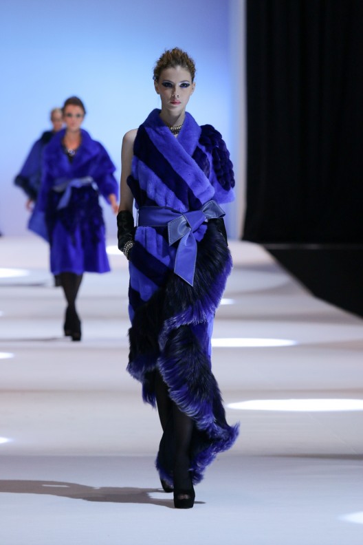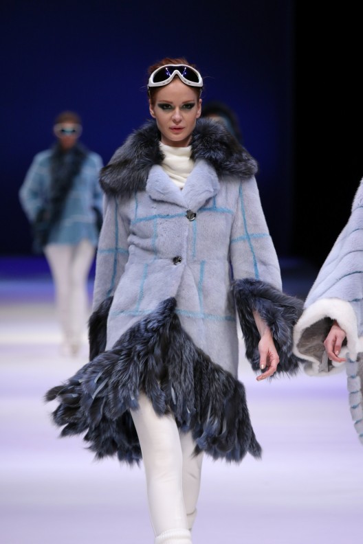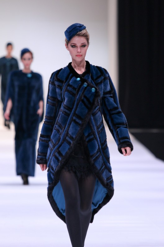 以染藍色剪毛及長毛水貂配狐毛及羔羊皮,加上不同剪裁及配搭方法組合出的深藍色調大褸及中褸,滲透高貴及神秘的氣質。褸擺及手肩位具動感的流線型設計,強化了皮草的立體層次。