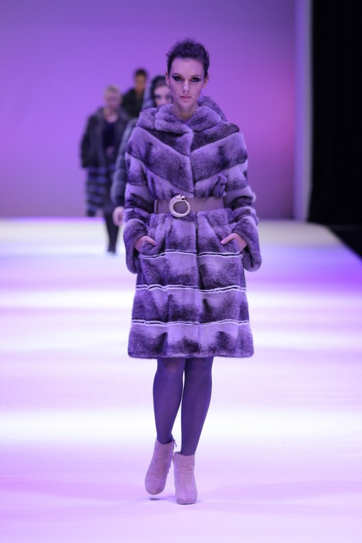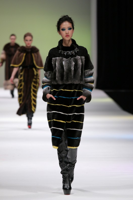 斑爛的條子圖案由染黃、藍、紅、橙、黑白等多種顏色拼合而成,有長褸和短褸系列,物料以水貂為主,配襯青紫蘭與狐毛。設計巧妙運用不同的顏色與毛皮,仿若大理石多變的花紋,營造出時尚高貴的效果。