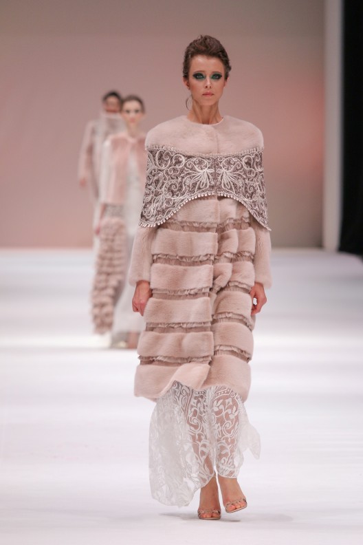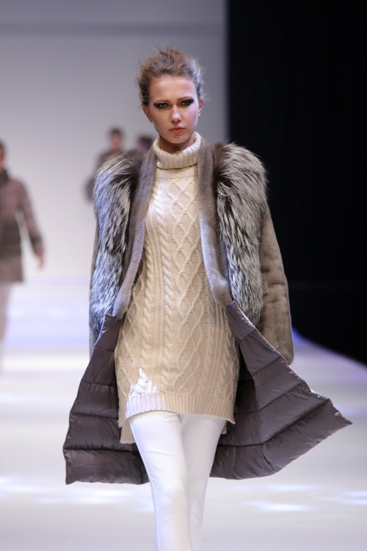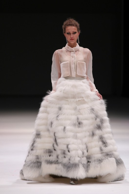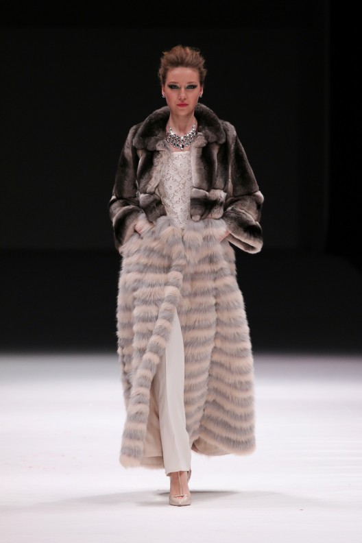 融入混合配搭特色的短披肩、長背心、長褲、長衣、長裙和短裙,以白色和米色的水貂、北極狐和白色羔羊皮造出新穎圖案和不規則的效果,其中以剪絨水貂配搭透明紗的襯衫盡顯優雅時尚。