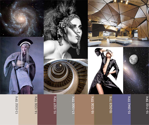 Colour – Galactic influences inspire a range of rich mineral alloy tones with domeykite grey, burnished bronze and sphalerite darks setting the stage for an eruption of smoky neutrals and a smoldering red oxide. An oxygenated ultra violet adds a supernatural element for an epic palette that is both earth and air, dark and light, ancient and futuristic.