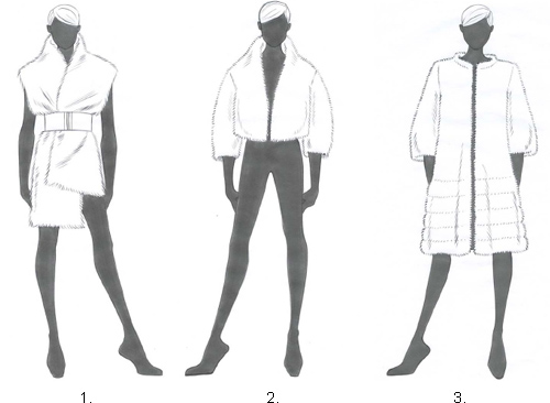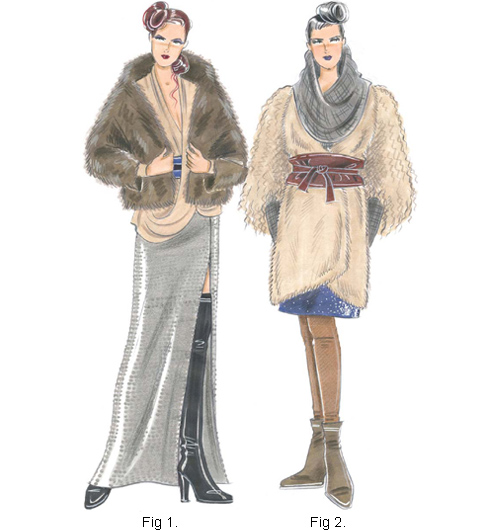 | Fig 1. | The fur shrug is given a voluminous update with rounded shoulder line and high neck for a futuristic cocooning feel and is worked back to an asymmetrical drape front jersey top and long length sequined skirt for a sci-fi glamour appeal. |