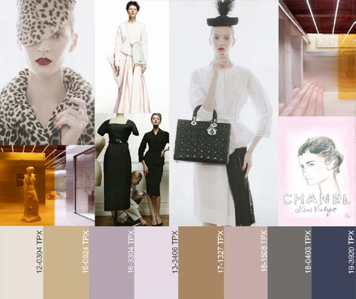 Our second trend is a refined update to last seasons Ladylike Kitsch that embodies a new quiet glamour permeating the air and offers a much more elegant slant on feminine dressing. Inspired by the famous haute couture houses of the 1940s and 1950s, in particular French atelier Christian Dior with its infamous New Look collection of 1947, that revolutionised the female silhouette with a post-war freshness and celebrated womanhood with full skirts and nipped waistlines. Beautiful fabrics, impeccable finishes and exquisite detailing all take center stage to create a modern re-invention of classic luxury. Retro undertones are key here but a sense of understated minimalism, paired with a sensual delicacy and loveliness is what brings this look in to the present. It's about embracing a modern femininity that sees women returning to the rhythm of their own gender and allowing their intuition to guide them towards that which honours and respects their natural instincts. Silhouette direction puts the emphasis on reworked classics with a new sense of proportion that is thoroughly modern and functional, all while retaining a precious delicacy that whispers of subtle elegance and soft feminine glamour.