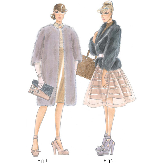 | Fig 1. | The retro 3/4 sleeve coat is given a clean modern look with an edge-to-edge front, collarless neck and recoloured fur. Here, it is worn over a patent leather and lace dress with detachable collar for a streamlined vintage appeal. |