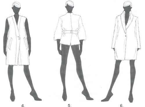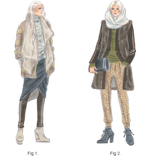 | Fig 2. | The belted kimono-style wrap coat is given a contrasting elbow length Mongolian lamb sleeve for a play on proportion and is worn with an oversized cowl neck knit, metallic leather skirt and matte legging for a layered look of juxtaposing textures. |