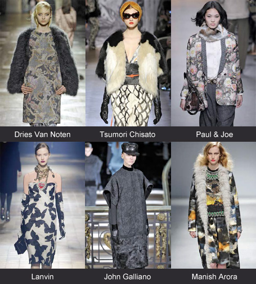 近来各种装饰图案已经成为时尚主流,巴黎的一个新迹象是皮草与印花面料结合 呈现出波西米亚风的混搭效果。Dries Van Noten和Paul & Joe柔和的印花裙与染 色皮草搭配和谐;Tsumori Chisato带图案的皮草坎肩搭配40年代的印花长裙,亮 点在腰上的那条日式和服腰带;Lanvin这条马皮质地的性感抹胸裙用蝴蝶图案营 造强烈的装饰效果;John Galliano黑色皮草与精美印花织物拼接的长裙低调内敛; Manish Arora全身的印花图案显得大胆热烈,但是狐狸毛的一圈领口镶边使得整 件服装调性马上柔和奢华。