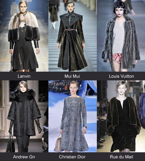 此次巴黎时装周用时尚的语言全新诠释复古。例如Lanvin这款经典的皮草短外套 更象一件机车夹克,豪放大色块带来全新的摩登感;Miu Miu 和 Louis Vuitton 的灵感都来自60年代,Miu Miu的长款皮草用一根腰带就束出了不同的时尚感; Louis Vuitton短款大衣,用炭灰色和竖纹让经典的廓形立刻时尚起来;Andrew Gn 传统的A字七分袖配上毛皮镶边的帽子以及黑色织物面料,全然一件派克大衣; Christian Dior及膝贴身长裙灵感来自70年代,选用了灰色羊皮,打造出双排扣的效果;Rue du Mail70年代boho风造型用里面的黑色天鹅绒裙外搭剪毛皮草短外 套,浑然一体并富有层次感。