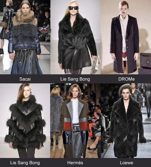 正如纽约时装周上所展示的,皮草和纤维面料拼接已经是当今的主流趋势。巴黎 时装周则将这个趋势进一步演绎:多种面料在同一服装上的运用创造出大胆的对 比效果。Sacai将三种不同的毛皮面料放在一件尼龙的棉服上,创造出一种色块 对比的效果;Lie Sang Bong 和 DROMe都善于在深色渐变上做文章,Lie Sang Bong用面料的对比打造出小披肩的效果;Loewe用十字交叉的技法让这件皮草大 衣带上了格纹的效果;Hermés将金属色和亮红色混搭在一起创造出大胆的对比 效果,然后用柔软的皮草把哑光和亮光统一起来。