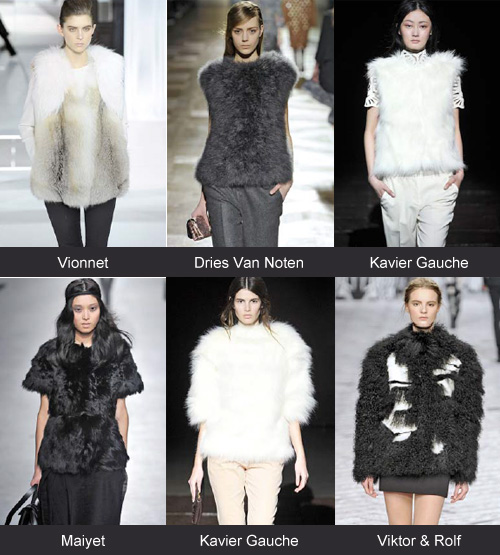 在巴黎时装周,长毛皮草外套成为一个主流的服装廓型。无袖或短袖的皮草上衣 是对上一季马甲款式的最新演绎。Vionnet的这件皮草让大自然的气息迎面而来; Dries Van Noten炭灰色的皮草女人味十足;Kavier Gauche这款白色上装配以激光 工艺的皮革雕刻的精美短袖,俏皮有趣;Maiyet的束腰款马甲时尚有型;Kavie Gauche和Viktor & Rolf体积感十足的中长袖皮草上装用黑白两色来体现前卫摩 登。