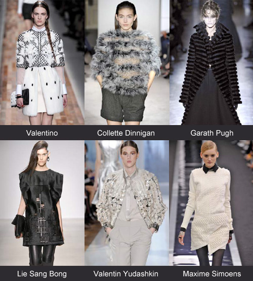 伦敦时装周时Burberry将皮革和金属搭配在马皮上营造有趣的装饰效果。到了巴 黎时装周这个趋势就愈演愈烈了。皮草经常和其他面料搭配在一起营造印花或图 案的效果。Valentino的这款裙装在网眼面料上打造出鸢尾华的图案,令人叹为观 止;Collette Dinnigan 和 Gareth Pugh均是条纹图案的皮草,不过一个用在蕾丝 的底衬上,另一个则是长大衣款;Lie Sang Bong的这件无袖圆领上衣运用了激光 雕刻和皮革嵌花工艺;Maxime Simoens用小块毛皮拼接营造出鱼鳞般的面料效 果;Valentin Yudashkin将毛皮与银色金属质感的皮革编织在一起,把一款传统的 机车夹克打造得摩登前卫。